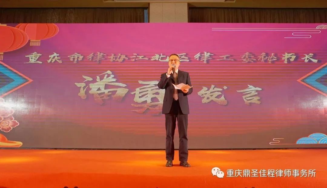 潘勇秘书长在年会上致辞。潘秘书长首先对重庆鼎圣佳程律师事务所再次获评“年度优秀律所”、朱清律师被评为“十大刑事律师办案能手”表示了祝贺,对疫情防控期间我所和我所律师所表现出的社会责任担当和无私奉献精神进行了表扬。随后,潘秘书长介绍了全市律师行业的基本情况及2022年度全市律师行业发展情况。