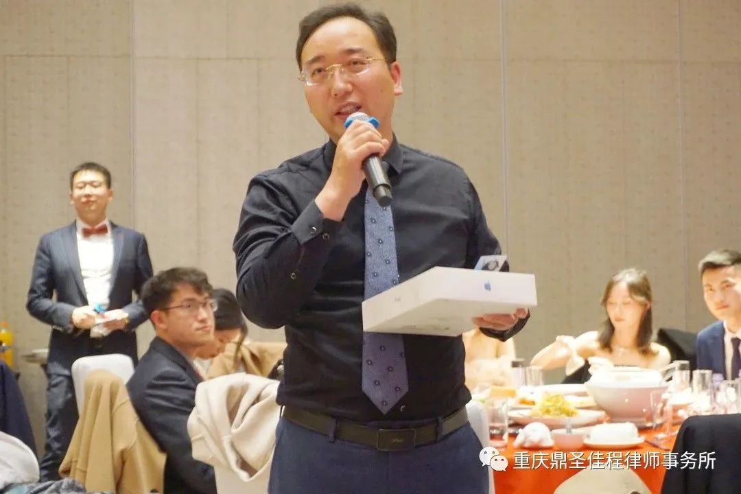 本次年会以“凝心聚力 笃志前行”为主题。年会伊始,胡冬舫主任上台致辞。胡主任首先对江北区司法局律工科科长、江北区律工委秘书长潘勇和江北区司法局律工科主任科员黄鑫的到来表示热烈的欢迎和衷心的感谢。胡主任提到,重庆鼎圣佳程律师事务所目前有132人,执业律师和实习律师有112人。去年,我所总创收达4200多万,合伙人人均创收达116万,在很多律所及企业经济下滑的情况下,我所却有较大幅度的增长。经过全所律师的共同努力,我们已经在江北嘴金融街3号这块全市最先进、最优秀、最富裕的办公区域牢牢的站稳了脚跟。胡主任指出,我所金融团队、1990团队、破产团队、房地产团队在近几年表现突出,他们为律所的发展做出了巨大贡献。胡主任强调,在成绩面前,我们不要骄傲,一方面要继续充满激情、昂扬向上、努力奋斗,一方面要从容不迫、淡定自信。未来,我所将继续引进优秀的人才,扩大律所规模,预计三年内在海南、长沙、深圳等地创办鼎圣佳程分所;我们将加强学习,从今年开始,律所将逐步选出优秀合伙人及优秀律师去先进国家和地区考察交流,加强与国际间的交流、交往与学习;我们将推出培养年轻人的计划,并且推出有效的、具体的措施和办法,帮助年轻人成长。